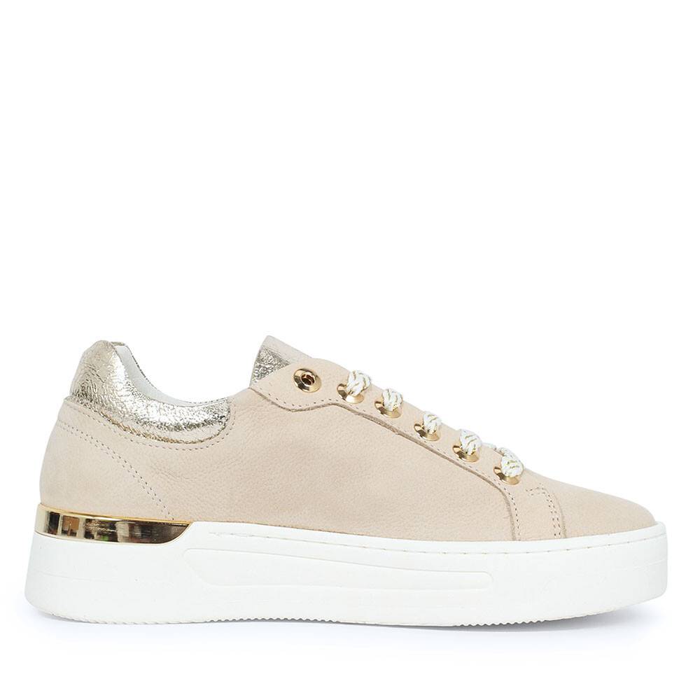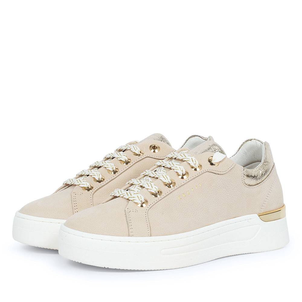 Deze luxueuze alledaagse sneaker is uitgevoerd in beige nubuck leer met speccio gouden panelen. Verder zijn deze dames sneakers verrijkt met tweetonige veters, gouden veterogen en Cruyff branding op de zijkant van de schoen. Van binnen is de schoen comfortabel gevoerd met zacht textielstof en het voetbed is uitneembaar. De schoen is geplaatst op een iconische platform zool voor de ultieme sporty-chic look!